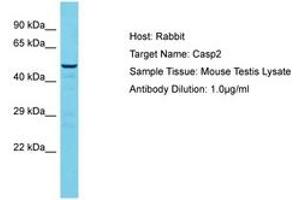 Synthetic peptide located between aa301-350 of mouse Casp2 (P29594, NP_031636). Percent identity by BLAST analysis: Mouse (100%).