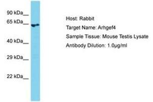 Synthetic peptide located between aa51-100 of mouse Arhgef4 (Q7TNR9, NP_898840). Percent identity by BLAST analysis: Mouse (100%).