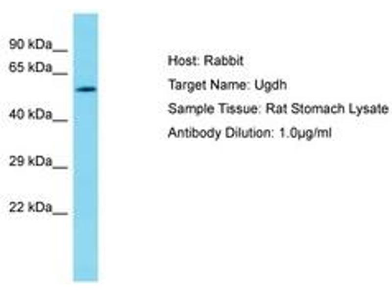 Synthetic peptide located between aa337-386 of rat Ugdh (O70199, NP_112615). Percent identity by BLAST analysis: Human, Chimpanzee, Mouse, Rat, Bovine, Rabbit, Horse, Pig (100%).