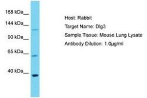 Synthetic peptide located between aa201-250 of mouse Dlg3 (NP_001171251). Percent identity by BLAST analysis: Human, Chimpanzee, Mouse, Rat, Bovine, Rabbit, Horse, Pig, Guinea pig (100%).