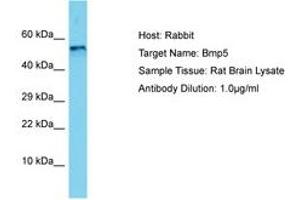Synthetic peptide located between aa327-376 of rat Bmp5 (D4A7P9, NP_001101638). Percent identity by BLAST analysis: Rat (100%).