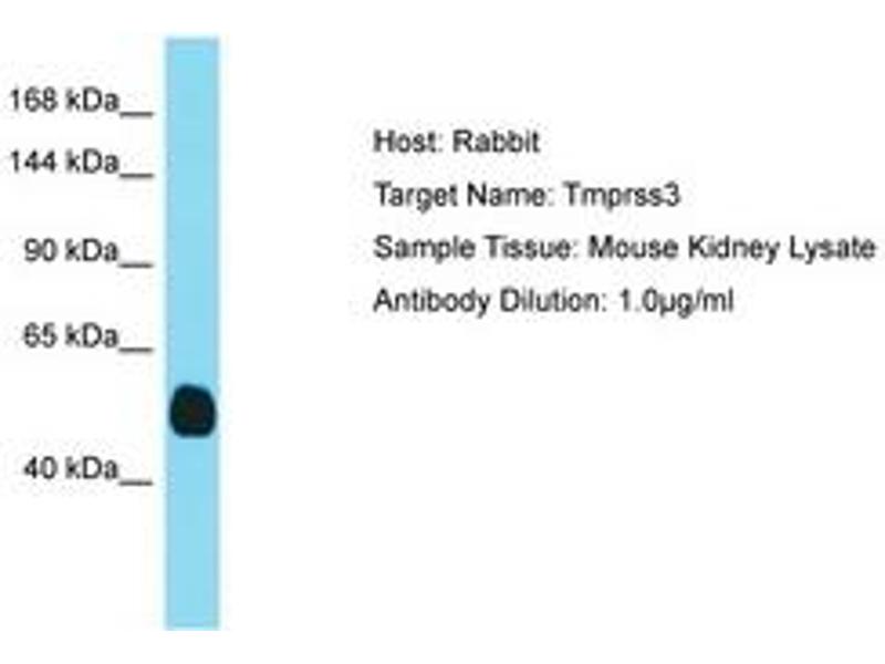 Synthetic peptide located between aa401-450 of mouse Tmprss3 (Q3TZ06, NP_001157248). Percent identity by BLAST analysis: Chimpanzee, Mouse, Rat (100%).