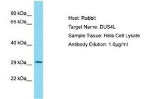 Synthetic peptide located between aa38-87 of human DUS4L (O95620, NP_853559). Percent identity by BLAST analysis: Human, Chimpanzee (100%).