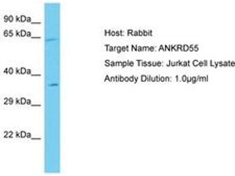 Synthetic peptide located between aa317-366 of human ANKRD55 (Q3KP44, NP_078945). Percent identity by BLAST analysis: Human (100%).