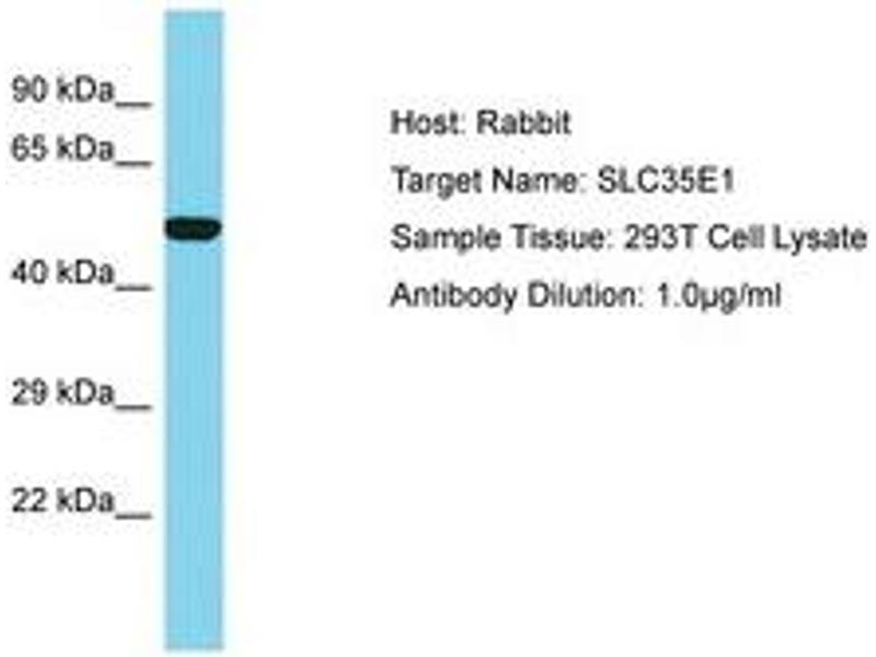 Synthetic peptide located between aa322-371 of human SLC35E1 (Q96K37, NP_079157). Percent identity by BLAST analysis: Human, Chimpanzee (100%).