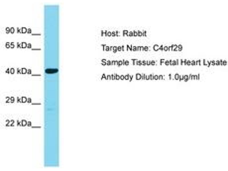 Synthetic peptide located between aa122-171 of human C4orf29 (Q0P651, NP_001034806). Percent identity by BLAST analysis: Human, Chimpanzee, Mouse, Rabbit (100%).