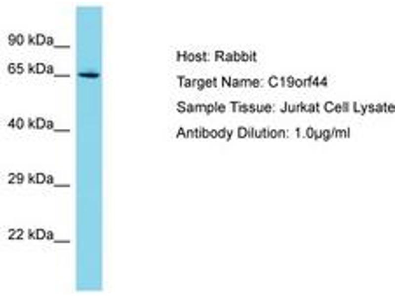 Synthetic peptide located between aa187-236 of human C19orf44 (Q9H6X5-2). Percent identity by BLAST analysis: Human, Chimpanzee (100%).