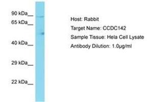 Synthetic peptide located between aa658-707 of human CCDC142 (Q17RM4-2, NP_116168). Percent identity by BLAST analysis: Human (100%).
