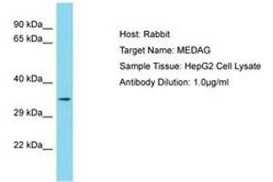 Synthetic peptide located between aa115-164 of human MEDAG (Q5VYS4, NP_116238). Percent identity by BLAST analysis: Human (100%).