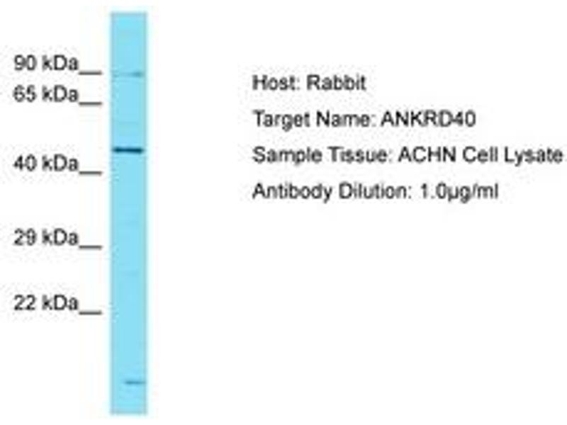Synthetic peptide located between aa195-244 of human ANKRD40 (Q6AI12, NP_443087). Percent identity by BLAST analysis: Human, Chimpanzee (100%).