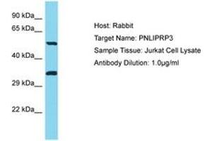 Synthetic peptide located between aa389-438 of human PNLIPRP3 (Q17RR3, NP_001011709). Percent identity by BLAST analysis: Human, Chimpanzee (100%).