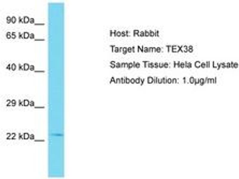 Synthetic peptide located between aa99-148 of human TEX38 (Q6PEX7, NP_001138946). Percent identity by BLAST analysis: Human (100%).