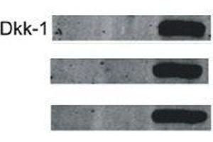 Background: Antagonizes canonical Wnt signaling by inhibiting LRP5/6 interaction with Wnt and by forming a ternary complex with the transmembrane protein KREMEN that promotes internalization of LRP5/6. DKKs play an important role in vertebrate development, where they locally inhibit Wnt regulated processes such as antero-posterior axial patterning, limb development, somitogenesis and eye formation. In the adult, Dkks are implicated in bone formation and bone disease, cancer and Alzheimer disease.