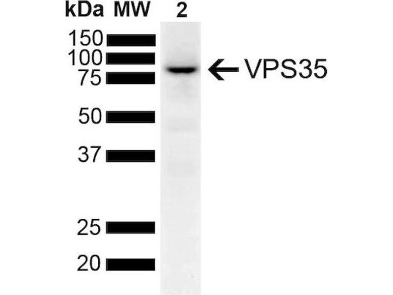A 1:1000 dilution of ABIN6932908 was sufficient for detection of VPS35 in 10 μg of SH-SY5Y by ECL immunoblot analysis using Goat Anti-Mouse IgG:HRP as the secondary antibody.