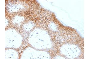 - Recognizes a protein of ~150 kDa, identified as Desmoglein-1 (DSG1). Desmoglein-1 is a member of the desmosomal cadherin family.Desmosomes are intercellular adhering junctions that represent cell surface attachment sites for intermediate filament. Desmocollins and desmogleins are the main desmosomal transmembrane proteins. Desmogleins consist of Dsg1, Dsg2, Dsg3, and Dsg4 isoforms.Within the desmosome, the extracellular domain of desmoglein is essential for calcium dependent heterophilic binding to the desmocollins, whereas the intracellular domain is essential for binding to the desmosomal plaque protein, plakoglobin. Desmoglein 1 is synthesized exclusively in the suprabasal layers. Intact and functionally active desmoglein 1 is essential to epidermal integrity.
