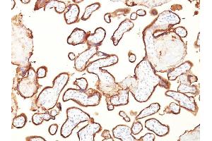 - Reacts with a 70 kDa membrane-bound isozyme (Regan and Nagao type) of Placental Alkaline Phosphatase (PLAP) occurring in the placenta during the 3rd trimester of gestation. It is highly specific for PLAP and shows no cross-reaction with other isozymes of alkaline phosphatase. Anti-PLAP reacts with germ cell tumors and can discriminate between these and other neoplasms. Somatic neoplasms e.g. breast, gastrointestinal, prostatic, and urinary cancers may also immunoreact with antibodies to PLAP. Anti-PLAP positivity in conjunction with anti-keratin negativity favors seminoma over carcinoma. Germ cell tumors are usually anti-keratin positive, but they regularly fail to stain with anti-EMA, whereas most carcinomas stain with anti-EMA. Anti-PLAP has been useful in the diagnosis of gestational trophoblastic disease.
