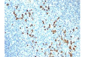 - Recognizes a protein of 75 kDa, identified as mu heavy chain of human immunoglobulins. It does not cross-react with alpha (IgA), gamma (IgG), epsilon (IgE), or delta (IgD), heavy chains, T-cells, monocytes, granulocytes, or erythrocytes. Monomeric IgM is expressed as a membrane bound antibody on the surface of B cells and as a pentamer when secreted by plasma cells. IgM antibody is prominent in early immune responses to most antigens. Aberrant levels are associated with immune deficiency states, hereditary deficiencies, myeloma, Waldenstrom's macroglobulinemia, chronic infection and hepatocellular disease. This MAb is useful in the identification of leukemias, plasmacytomas, and certain non-Hodgkin's lymphomas. The most common feature of these malignancies is the restricted expression of a single heavy chain class. Demonstration of clonality in lymphoid infiltrates indicates that the infiltrate is clonal and therefore malignant.
