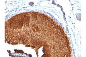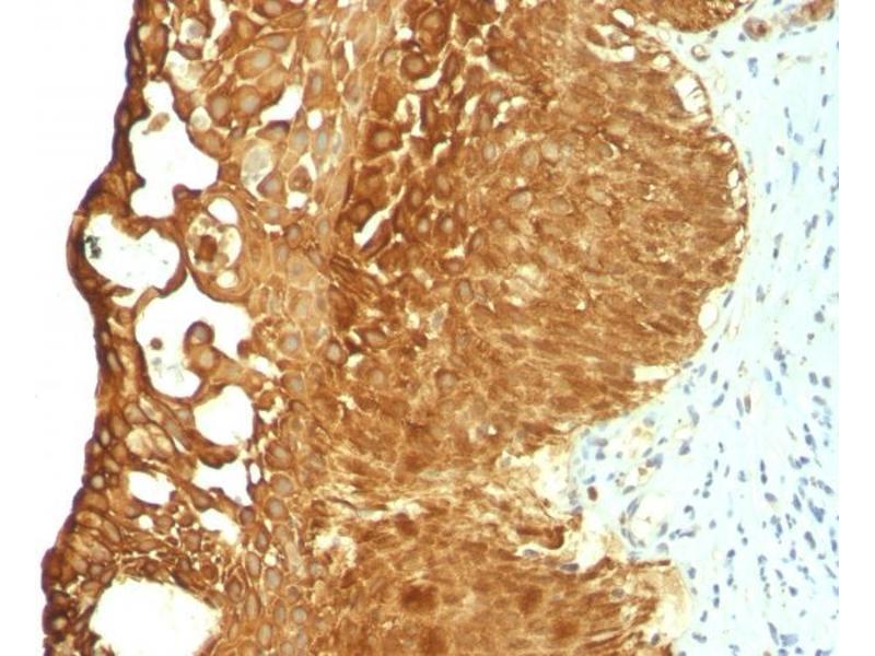 - Recognizes a protein of 40 kDa, identified as cytokeratin-19 (CK19), which is expressed in sweat gland, mammary gland ductal and secretory cells, bile ducts, gastrointestinal tract, bladder urothelium, oral epithelia, esophagus, and ectocervical epithelium. Anti-CK19 reacts with a wide variety of epithelial malignancies including adenocarcinomas of the colon, stomach, pancreas, biliary tract, liver, and breast. Perhaps the most useful application is the identification of thyroid carcinoma of the papillary type, although 50 % -60 % of follicular carcinomas are also labeled. Anti-CK19 is a useful marker for detection of tumor cells in lymph nodes, peripheral blood, bone marrow and breast cancer.