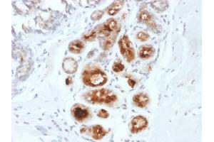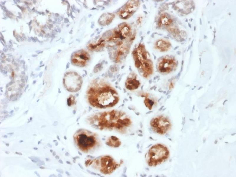 - Mammaglobin is a 93 amino acid glycoprotein with homology to other secretoglobin-uteroglobin family members. It was originally identified as a breast cancer restricted biomarker by differential screening. Mammaglobin related to secretoglobin family that includes human uteroglobin and lipophilin. Mammaglobin antibody stains cytoplasm of normal breast epithelial cells as well as primary and metastatic breast carcinomas. Mammaglobin expression is absent in prostate, kidney, colon, rectum, small intestine, stomach, pancreas, lung, and thyroid tissues. Mammaglobin may be used as part of an immunohistochemical panel for determination of metastatic breast carcinoma and tumor of unknown primary origin.
