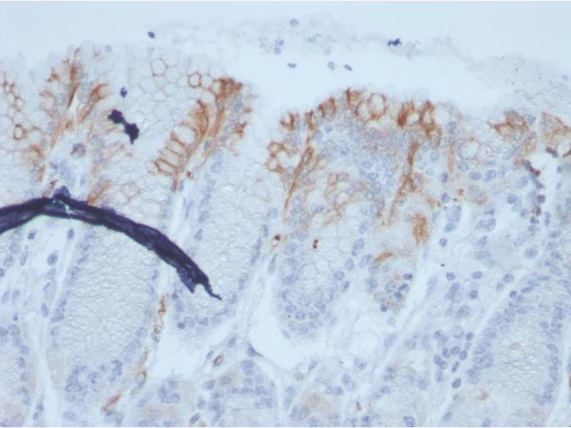 - Recognizes a single glycoprotein of 520 kDa, identified as mucin 2 (MUC2). This MAb shows no cross-reaction with human milk fat globule membranes, MUC1, or MUC3. Its epitope has been defined as GTQTP (GlyThrGlnThrPro). Mucins are high molecular weight glycoproteins, which constitute the major component of the mucus layer that protects the gastric epithelium. MUC2 is specifically expressed in goblet cells of the small intestine in about 65 % of colonic carcinomas and about 40 % of gastric carcinomas. MUC2 is rarely expressed outside of the GI tract with the exceptions of mucinous carcinoma of breast and clear cell-type carcinomas of the ovary.