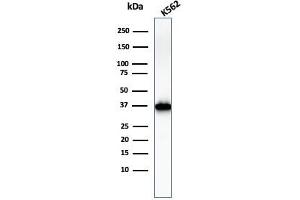- Recognizes a 33 kDa glycoprotein, identified as Nucleophosmin (NPM). It is predominantly localized in the nucleus of cells in most tissues. NPM is involved in ribosomal assembly and rRNA transport. It is an abundant protein that is highly phosphorylated by Cdc2 kinase during mitosis. This phosphoprotein moves between the nucleus and the cytoplasm. It is thought to be involved in several processes including regulation of the ARF/p53 pathway. A number of genes are fusion partners, in particular the anaplastic lymphoma kinase gene on chromosome 2. Mutations in exon 12 affecting the C-terminus of the protein are associated with an aberrant cytoplasmic location. Mutations in this gene are associated with acute myeloid leukemia. The antibody may be a useful aid for classification of acute myeloid leukemia.
