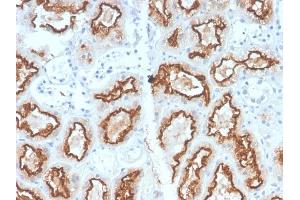- Recognizes a glycoprotein of ~200 kDa, identified as carbonic anhydrase IX (CAIX/gp200). Its epitope resides in the carbohydrate domain of gp200. It shows no significant cross-reactivity with other carbohydrate determinants, such as the Lewis blood group antigens, epithelial membrane antigen, HMFG, and AB blood group antigens. In normal kidney, gp200 is localized along the brush border of the pars convoluta and pars recta segments of the proximal tubule, as well as focally along the luminal surface of Bowman's capsule adjoining the outgoing proximal tubule. Reportedly, gp200 is expressed by 93 % of primary and 84 % of metastatic renal cell carcinomas. This MAb may be useful in the investigations of carcinomas of proximal nephrogenic differentiation especially those showing tubular differentiation.