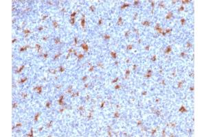- This antibody recognizes a glycoprotein of 110 kDa, which is identified as CD68. It is important for identifying macrophages in tissue sections. It stains macrophages in a wide variety of human tissues, including Kupffer cells and macrophages in the red pulp of the spleen, in lamina propria of the gut, in lung alveoli, and in bone marrow. It reacts with myeloid precursors and peripheral blood granulocytes. It also reacts with plasmacytoid T cells, which are supposed to be of monocyte/macrophage origin. It shows strong granular cytoplasmic staining of chronic and acute myeloid leukemia and also reacts with rare cases of true histiocytic neoplasia. Lymphomas are negative or show few granules.