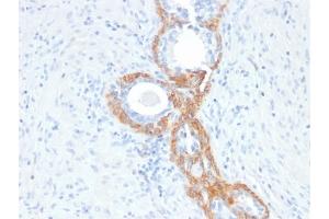 - This antibody recognizes CK1, CK5, CK10 and CK14. In normal epithelia, it stains stratified epithelia, myoepithelial cells and basal cells in the prostate gland and bronchi. This MAb shows no reactivity with hepatocytes, pancreatic acinar cells, proximal renal tubules, or endometrial glands, there is no reactivity with cells derived from simple epithelia. Mesenchymal tumors, lymphomas, melanomas, neural tumors, and neuroendocrine tumors are negative with this antibody. It stains myoepithelial cells and has been shown to be useful in distinguishing prostate adenocarcinoma from benign prostate. This antibody has also been useful in separating benign from malignant intraductal breast proliferations.