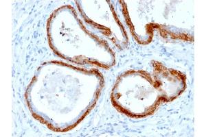 - This antibody recognizes CK1, CK5, CK10 and CK14. In normal epithelia, it stains stratified epithelia, myoepithelial cells and basal cells in the prostate gland and bronchi. This MAb shows no reactivity with hepatocytes, pancreatic acinar cells, proximal renal tubules, or endometrial glands, there is no reactivity with cells derived from simple epithelia. Mesenchymal tumors, lymphomas, melanomas, neural tumors, and neuroendocrine tumors are negative with this antibody. It stains myoepithelial cells and has been shown to be useful in distinguishing prostate adenocarcinoma from benign prostate. This antibody has also been useful in separating benign from malignant intraductal breast proliferations.