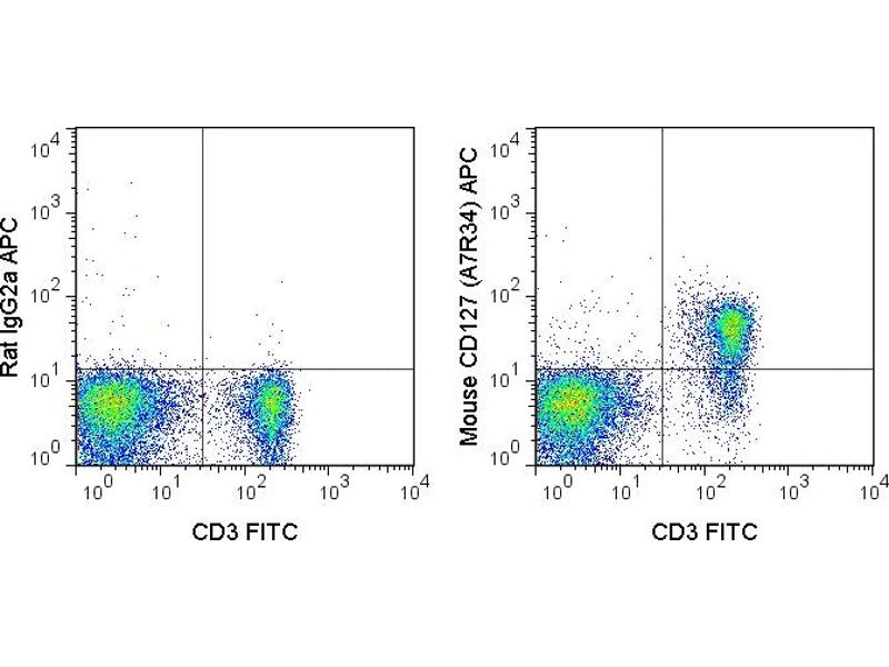 - The A7R34 antibody is specific for mouse CD127, a 60-90 kDa cell surface protein also known as the Interleukin-7 Receptor alpha chain, or IL-7R alpha. CD127 is typically expressed at the cell surface as a heterodimer with the common gamma chain (CD132). This complex acts as the functional receptor for IL-7, a cytokine important in T and B cell development, and in mature T cell homeostasis. A second cytokine known as Thymic Stromal Lymphopoietin (TSLP) also binds to a receptor complex of CD127 and the TSLPR chain to trigger activation of dendritic cells, and is involved in B cell development, allergy and autoimmunity.The A7R34 antibody may be used as a phenotypic marker for CD127 on immature B cells, on subsets of thymocytes which are double negative (CD4-CD8- ) or single positive (CD4+ or CD8+), and at low levels on mature, peripheral T cells. CD127 is a key marker, when used in combination with CD4 and CD25, to distinguish Treg and effector/memory Treg populations known as T(REM).