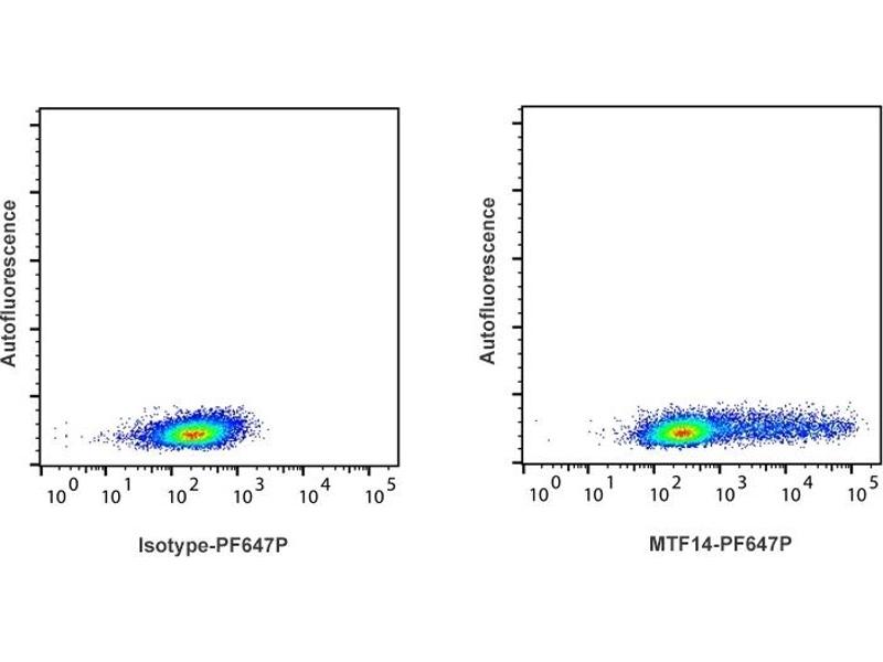 - Detection of ferret IFN-γ producing cells by flow cytometry. 5 μL is recommended for staining of 1 million cells in a total volume of 50 μL. Detection of IFN-γ by flow cytometry in viable ferret spleen cells. Cells were stimulated for 16 hours in the presence of PMA/ionomycin and Brefeldin A. Cells were then fixed and permeabilized using 4 % paraformaldehyde and saponin, and subsequently stained with MTF14-PF647P (right panel). The left panel depicts cells stained with a matched isotype control antibody. The dot plots derive from gated events of typical lymphocyte characteristics in forward and side light scatter. Flow cytometry was performed on a BD FACSVerse system.