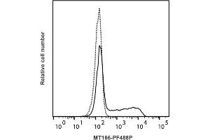 - Detection of equine IFN-γ producing cells by flow cytometry. 5 μL is recommended for staining of 1 million cells in a total volume of 50 μL. PF488P is excited by the blue laser (488 nm). The excitation max is 490 nm and the emission max is 516 nm. Detection of IFN-γ by flow cytometry in viable equine PBMC. Cells were stimulated for 16 hours in the presence of PMA/ionomycin and Brefeldin A. Cells were then fixed and permeabilized using 4 % paraformaldehyde and saponin, and subsequently stained with MT166- PF488P (solid line). Matched isotype control antibody (dashed line). The histogram derives from gated events of typical lymphocyte characteristics in forward and side light scatter. Flow cytometry was performed on a BD FACSVerse system.