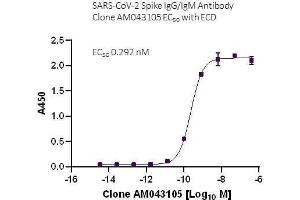 COVID-19, which is short for coronavirus disease 2019, is the official name of the respiratory disease caused by infection with the novel coronavirus SARS-CoV-2. The virus that causes COVID-19 was named SARS-CoV-2 because it is a coronavirus genetically similar to, yet distinct from, the virus that caused the severe acute respiratory syndrome (SARS) outbreak in 2003. Studying the details of how this virus replicates and causes the disease will allow scientists and physicians to more rapidly develop fast and accurate methods of detection as well as to deploy therapeutic and vaccine strategies. This antibody was derived from COVID-19 patients who have cleared the virus. Patient serum IgG was sequenced and expressed as a chimeric full-length human immunoglobulin in mammalian 293 cells. This chimeric antibody contains a heavy chain CH1 that is IgG1 isotype, whereas its CH2/CH3/CH4 regions are IgM isotype. The antibody contains a Flag Tag and an 8X His Tag at the C-terminus. SARS-CoV-2 Spike IgG/IgM Antibody (AM5) (Clone AM5 (105-43)) was raised in a Human host. It has been validated for use in ELISA, it has been shown to react with Virus samples.