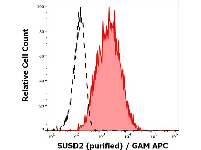 Sushi domain containing 2,SUSD2 (sushi domain containing protein 2) is a type I transmembrane protein, that serves as an important marker of bone marrow-derived mesenchymal stem-like cells (bone marrow stromal cells). These pluripotent cells are important for techniques of autologous cell therapy, and can be collected from e.g. endometrium, or palatine tonsil. SUSD2 seems to be a tumor supresor, and is down-regulated in colon cancer tissues, whereas it is highly expressed e.g. in breast cancer.
