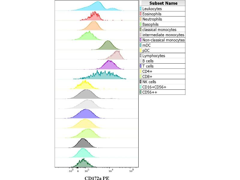 The mouse monoclonal antibody 15-414 recognizes en extracellular epitope of CD172a (SIRP alpha), an approximately 90 kDa transmembrane glycoprotein expressed on cells of myeloid origin and neurons.