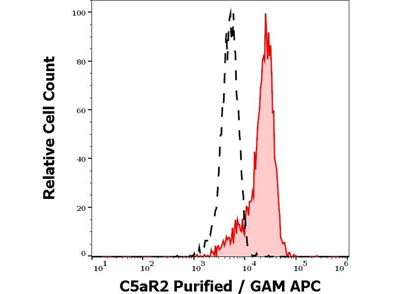 The mouse monoclonal antibody 1D9-M12 recognizes an extracellular epitope on C5aR2 (C5L2), a C5a complement receptor, which is coexpressed with C5aR1 (CD88) in neutrophils, as well as e.g. in mast cells, astrocytes, or macrophages.