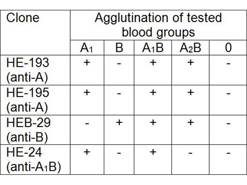 The antibody HE-193 recognizes human blood group A (monofucosyl and difucosyl A antigens with chain types 1 and 2, A antigens with chain types 3, 4, 5, 6) and Forssman antigen.