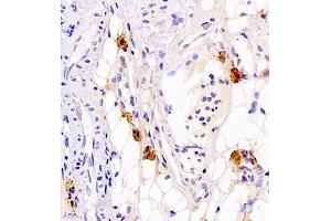 Calcitonin is a 32 amino acid peptide hormone synthesized by the parafollicular cells of the thyroid. It causes a rapid, but short lived, reduction in serum calcium and phosphate by promoting the incorporation of those ions in the bones. This effect is opposite to that of parathyroid hormone. Staining for calcitonin may be used for the identification of a spectrum of C cell proliferative abnormalities ranging from C cell hyperplasia to invasive tumors.