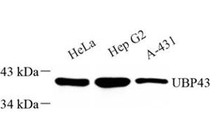 - USP18(UBP43) is a 43 kDa protein that is known as an ISG15-deconjugating enzyme and an inhibitor of type I IFN signaling independent of its enzyme activity. USP18 can efficiently cleave only ISG15 fusions including native ISG15 conjugates linked via isopeptide bonds. It can be detected two bands(apparent MW of 38 and 35 kDa), the faster migrating one results from proteolytic processing in human primary hepatocytes.