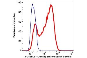 - The clone 6D5, a mouse monoclonal antibody selectively binds with a 50-55 kD cell surface protein commonly known as Programmed cell death 1 (PD-1) or CD279, a member of the immunoglobulin superfamily. PD-1 expression is mostly observed in activated T cells and B cells, and also in dendritic cells. PD-1 signals via binding its two ligands, PD-L1 and PD-L2. Upon ligand binding, PD-1 signaling inhibits T-cell activation, leading to reduced proliferation, cytokine production, and T cell death. Blocking of PD-1 by its antibody restores T cells immunity against tumor and infectious agents. PD-1-blockade based immunotherapy is, therefore, highly clinically useful against various types of cancers and infectious diseases.