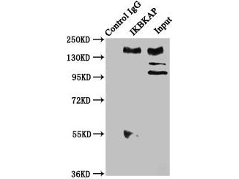 Aliases: DKFZp781H1425 antibody, DYS antibody, Dysautonomia (Riley Day syndrome hereditary sensory autonomic neuropathy type III) antibody, Elongator complex protein 1 antibody, ELP 1 antibody, ELP1 antibody, ELP1_HUMAN antibody, FD antibody, FLJ12497 antibody, IKAP antibody, IkappaB kinase complex associated protein antibody, IkappaB kinase complex-associated protein antibody, ikbkap antibody, IKI 3 antibody, IKI3 antibody, IKK complex associated protein antibody, IKK complex-associated protein antibody, Inhibitor of kappa light polypeptide gene enhancer in B cells kinase complex associated protein antibody, OTTHUMP00000063889 antibody, p150 antibody, TOT 1 antibody, TOT1 antibody