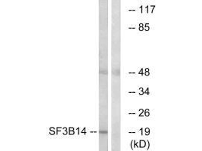 Zhang Q.-H., Genome Res. 10:1546-1560(2000).Aliases: Ht006 antibody, P14 antibody, PM14_HUMAN antibody, Pre mRNA branch site protein p14 antibody, Pre-mRNA branch site protein p14 antibody, SAP14 antibody, SF3B 14 kDa subunit antibody, SF3B14 antibody, SF3B14a antibody, Splicing factor 3B, 14 kDa subunit antibody