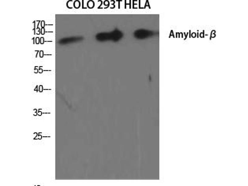 - Rabbit Anti-Amyloid-β Polyclonal Antibody,APP, A4, AD1, Amyloid beta A4 protein, ABPP, APPI, APP, Alzheimer disease amyloid protein, Cerebral vascular amyloid peptide, CVAP, PreA4, Protease nexin-II, PN-II,APP encodes a cell surface receptor and transmembrane precursor protein (amyloid beta precursor protein) that is cleaved by secretases to form a number of peptides. Some of these peptides are secreted and can bind to the acetyltransferase complex APBB1/TIP60 to promote transcriptional activation, while others form the protein basis of the amyloid plaques found in the brains of patients with Alzheimer disease. In addition, two of the peptides are antimicrobial peptides, having been shown to have bacteriocidal and antifungal activities. Mutations in this gene have been implicated in autosomal dominant Alzheimer disease and cerebroarterial amyloidosis (cerebral amyloid angiopathy). Multiple transcript variants encoding several different isoforms have been found for APP.,Amyloid beta A4 protein