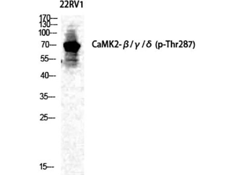 Rabbit Anti-CaMKIIβ/γ/δ (phospho Thr287) Polyclonal Antibody,CAMK2B, CAM2, CAMK2, CAMKB, Calcium/calmodulin-dependent protein kinase type II subunit beta, CaM kinase II subunit beta, CaMK-II subunit beta, CAMK2G, CAMK, CAMK-II, CAMKG, Calcium/calmodulin-dependent protein kinase type II subunit gamma,The product of CAMK2B (calcium/calmodulin dependent protein kinase II beta) belongs to the serine/threonine protein kinase family and to the Ca (2+) /calmodulin-dependent protein kinase subfamily. Calcium signaling is crucial for several aspects of plasticity at glutamatergic synapses. In mammalian cells, the enzyme is composed of four different chains: alpha, beta, gamma, and delta. The product of CAMK2B is a beta chain. It is possible that distinct isoforms of this chain have different cellular localizations and interact differently with calmodulin. Alternative splicing results in multiple transcript variants.,Calcium calmodulin-dependent protein kinase type II subunit beta
