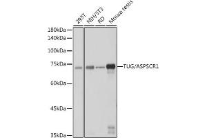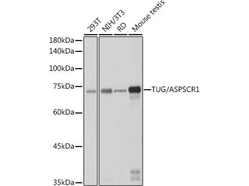 The protein encoded by this gene contains a UBX domain and interacts with glucose transporter type 4 (GLUT4). This protein is a tether, which sequesters the GLUT4 in intracellular vesicles in muscle and fat cells in the absence of insulin, and redistributes the GLUT4 to the plasma membrane within minutes of insulin stimulation. Translocation t(X,17)(p11,q25) of this gene with transcription factor TFE3 gene results in a ASPSCR1-TFE3 fusion protein in alveolar soft part sarcoma and in renal cell carcinomas. Multiple alternatively spliced transcript variants have been found.,ASPSCR1, ASPCR1, ASPL, ASPS, RCC17, TUG, UBXD9, UBXN9, tether containing UBX domain for GLUT4,Cancer,Signal Transduction,Cell Biology & Developmental Biology,Growth factor,Endocrine & Metabolism,Lipid Metabolism,TUG