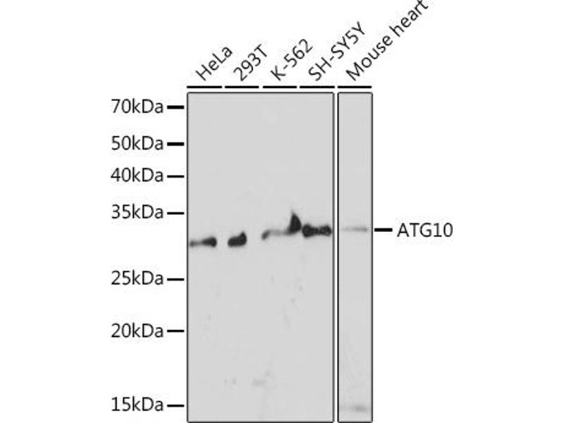 Autophagy is a process for the bulk degradation of cytosolic compartments by lysosomes. ATG10 is an E2-like enzyme involved in 2 ubiquitin-like modifications essential for autophagosome formation: ATG12 (MIM 609608)-ATG5 (MIM 604261) conjugation and modification of a soluble form of MAP-LC3 (MAP1LC3A, MIM 601242), a homolog of yeast Apg8, to a membrane-bound form (Nemoto et al., 2003 [PubMed 12890687]).[supplied by OMIM, Mar 2008],APG10, APG10L, pp12616,Autophagy,Autophagy_ATGs,Cancer,Cardiovascular,Cell Biology & Developmental Biology,Endocrine & Metabolism,Heart,Neurodegenerative Diseases,Neuroscience,Tumor suppressors,Ubiquitin,ATG10