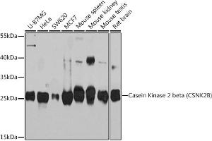 This gene encodes the beta subunit of casein kinase II, a ubiquitous protein kinase which regulates metabolic pathways, signal transduction, transcription, translation, and replication. The enzyme is composed of three subunits, alpha, alpha prime and beta, which form a tetrameric holoenzyme. The alpha and alpha prime subunits are catalytic, while the beta subunit serves regulatory functions. The enzyme localizes to the endoplasmic reticulum and the Golgi apparatus. Two transcript variants encoding different isoforms have been found for this gene.,CK2B,CK2N,CSK2B,G5A,CSNK2B,Ckb1,Ckb2,Signal Transduction,Kinase,Cell Biology & Developmental Biology,Cell Cycle,Stem Cells,CSNK2B