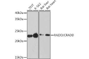 This gene encodes a protein containing a death domain (DD) motif. This protein recruits caspase 2/ICH1 to the cell death signal transduction complex, which includes tumor necrosis factor receptor 1 (TNFR1A) and RIPK1/RIP kinase, and acts in promoting apoptosis. A mutation in this gene was associated with mental retardation. A related pseudogene is found on chromosome 3. Alternative splicing results in multiple transcript variants. [provided by RefSeq, Feb 2016],MRT34, RAIDD,Apoptosis,Apoptosis_Mitochondrial Control of Apoptosis,Cancer,Cell Biology & Developmental Biology,Death Receptor Signaling Pathway,Invasion and Metastasis,CRADD