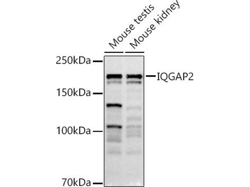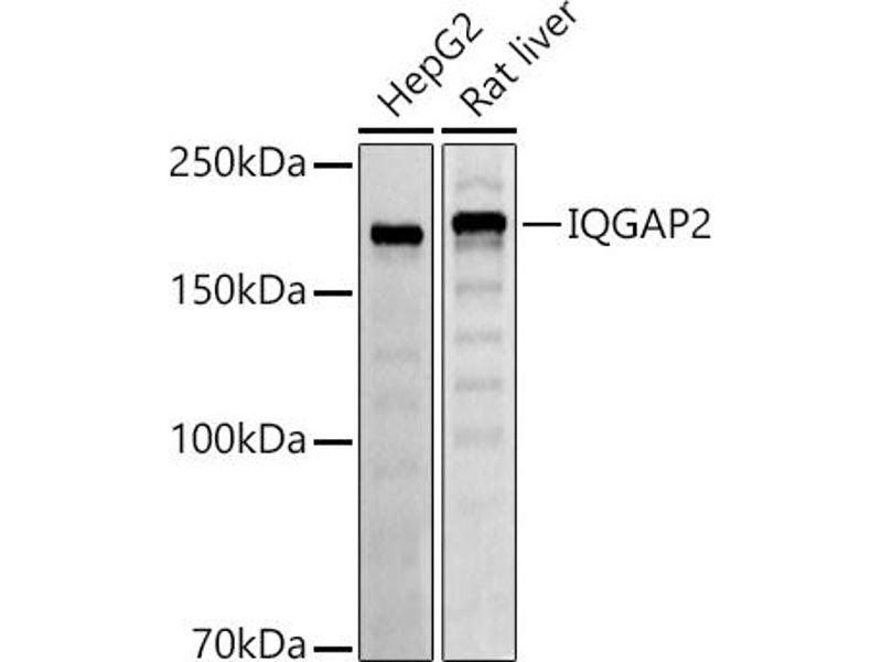 This gene encodes a member of the IQGAP family. The encoded protein contains three IQ domains, one calponin homology domain, one Ras-GAP domain and one WW domain. This protein interacts with components of the cytoskeleton, with cell adhesion molecules, and with several signaling molecules to regulate cell morphology and motility. It also acts as a tumor suppressor and has been found to play a role in regulating innate antiviral responses. Alternative splicing results in multiple transcript variants.,IQGAP2,Signal Transduction,G protein signaling,Signal Transduction,Cell Biology & Developmental Biology,Cell Adhesion,Neuroscience,Calcium Signaling,IQGAP2