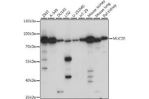 This gene encodes a member of the mucin protein family. Mucins are high molecular weight glycoproteins secreted by many epithelial tissues to form an insoluble mucous barrier. The C-terminus of this family member associates with the multifunctional docking site of the MET proto-oncogene and suppresses activation of some downstream MET signaling cascades. The protein features a mucin tandem repeat domain that varies between two and six copies in most individuals. Multiple variants encoding different isoforms have been found for this gene. A related pseudogene, which is also located on chromosome 3, has been identified.,MUC20,MUC-20,mucin-20,Signal Transduction,Cell Biology & Developmental Biology,Cytoskeleton,Extracellular Matrix,MUC20